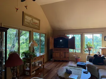 3bd/2bth home at the top of the hill with views for miles! Set on half an acre lot with mature trees, feels like you are in the North Woods! Huge wraparound deck & full walkout basement w/ studio apartment. Addition (about 10 years ago) added living/dining room combo with Brazilian Cherry floors & vaulted ceilings. 2nd Level/converted attic space is great primary suite with FP. 3 car attached garage & detached 1 car garage (rebuilt in 2025). Roof was replaced approx 10 years ago. Playground across the street. to downtown Algonquin & the river! Property being sold as-is.